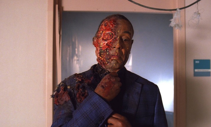 К тому времени AMC уже вовсю пожинал плоды рискованного хода с отказом от повторов «Короткого замыкания 2» и запуском собственного контента. Одним из главных хитов телесети стала экранизация комикса «Ходячие мертвецы». Наличие сразу двух популярных проектов сыграло на руку AMC, когда Гиллиган начал планировать смерть Густаво Фринга. Однажды Винс поинтересовался, кто мог бы помочь в создании столь впечатляющей сцены. Руководство канала свело его с главным гримером «Ходячих мертвецов» Грегом Никотеро. Компьютерная графика достигла огромных высот и начала поражать воображение даже в многосерийных проектах, но Грег не стал полагаться исключительно на CGI и взял все самое лучшее из двух миров. Эксперты по гриму сняли слепок с лица Джанкарло Эспозито. Затем они изготовили легкую и удивительно реалистичную маску для той половины лица, которая должна была быть поражена взрывом. Актер просидел несколько часов в кресле гримера, после чего вышел на съемочную площадку и сыграл ставший культовым выход Фринга из комнаты Гектора. Съемками данного эпизода руководил сам Гиллиган. Винс оказался перфекционистом и переснимал сцену девятнадцать раз, чтобы добиться действительно идеального кадра. Любопытно, что сам взрыв создали без компьютерной графики: после серии предварительных тестов трюкачи сериала выбили дверь и обрушили потолочные плиты с помощью пневматических пушек. Затем в дело вступили эксперты по CGI, которые соединили кадры после взрыва двери с самым удачным дублем выхода Фринга. После этого им осталось лишь обработать отдельные области латексной маски, чтобы усилить ощущение того, что у Гуса действительно нет половины лица.